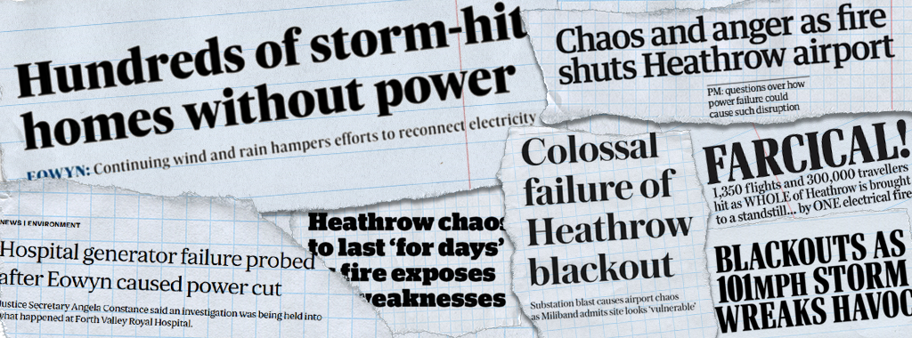 On January 24, 2025, during Storm Éowyn, Forth Valley Royal Hospital in Scotland experienced a 70-minute power outage. Despite having backup generators, a significant power surge caused both the mains and generator supplies to trip, leaving critical systems without power.